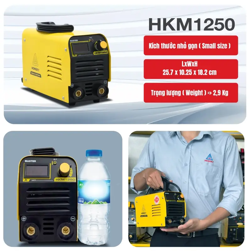 Máy hàn que Hồng Ký Master mini HKM1250 nhỏ gọn siêu khoẻ. Hàn que từ 2.6 - 3.2mm, đặc biệt hàn que 2.6mm liên tục. Với mức giá hợp lý nhưng chiếc máy được trang bị các tính năng cao cấp như Mồi lửa nhanh Hot Start, Bù hồ quang Arc Force. Phù hợp dùng trong gia đình, vô cùng tiện lợi và linh hoạt.